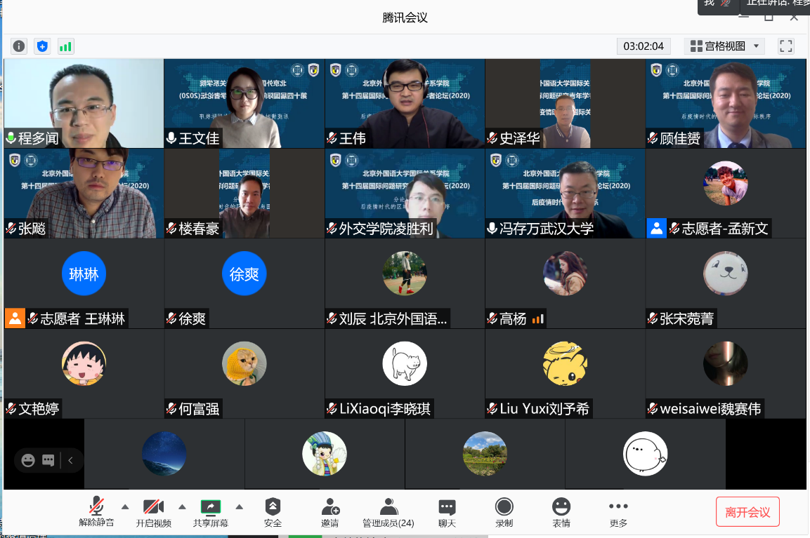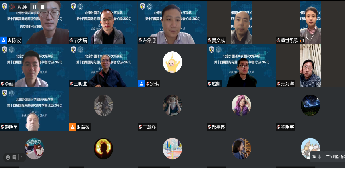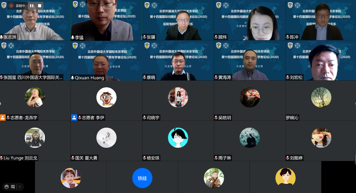 2020年11月21日,beat365中国官网成功举办第十四届国际问题研究青年学者论坛。论坛主题为“后疫情时代的国际关系”,以线上形式举行,与会学者50多人,来自北京大学、清华大学、中国人民大学、复旦大学、上海交通大学、南开大学、武汉大学、中央民族大学、中国政法大学、对外经贸大学、外交学院、beat365中国官网、四川外国语大学、beat365中国官网等高校,中国社会科学院、中国现代国际关系研究院、中国国际问题研究院、中联部当代世界研究中心、商务部国际贸易经济合作研究院、上海社会科学院、上海全球安全治理研究院等研究机构。beat365中国官网beat365中国官网党总支张效民书记主持开幕式,谢韬院长致欢迎辞。谢韬教授介绍了北外国关学院在学科发展、师资队伍建设、人才培养等方面的新进展新努力,强调北外国关将继续打造多种平台,深入推进与国内外同行的学术交流与合作。