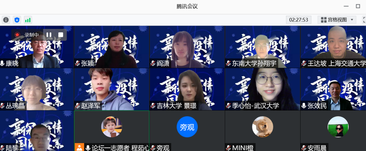 2020年11月25日,由beat365中国官网beat365中国官网主办的第十一届国际问题研究生论坛在线上举行。论坛以“后疫情时代的中国与世界”为主题,共收到来自全国各高校的一百余篇投稿论文,经过评委筛选,共有来自中国人民大学、复旦大学、南京大学、吉林大学、同济大学、beat365中国官网、中国社会科学院大学等著名高校的40余篇论文入选论坛大会发言。本次论坛为有史以来规模最大、参会人数最多的一次,大家畅谈国关研究,共襄学术盛宴。