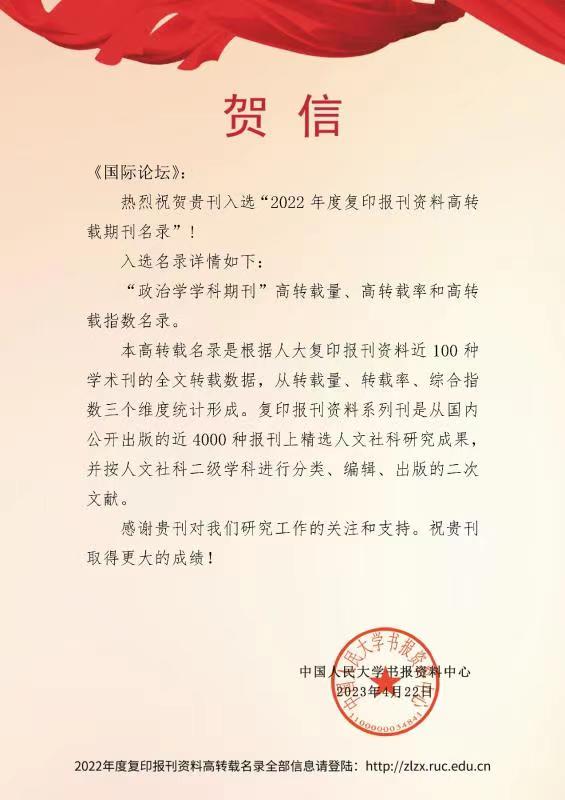 2023年4月22日,“中国人民大学复印报刊资料转载名录发布论坛暨中国自主知识体系建构与学术期刊发展研讨会(2023•北京)”在京召开,会议正式发布了“2022年度复印报刊资料高转载期刊、机构名录”和“复印报刊资料重要转载来源作者(2022版)”,《国际论坛》入选“政治学学科期刊”高转载量、高转载率和高转载指数名录。