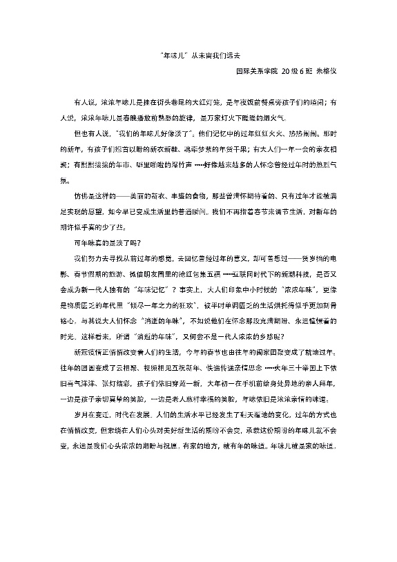2006班朱格仪同学的文章引起了我们的反思,在变迁的社会中,“年味儿”的表现形式也会改变,但其中蕴含的“家的味道”是恒久不变的。