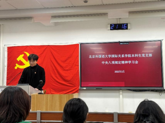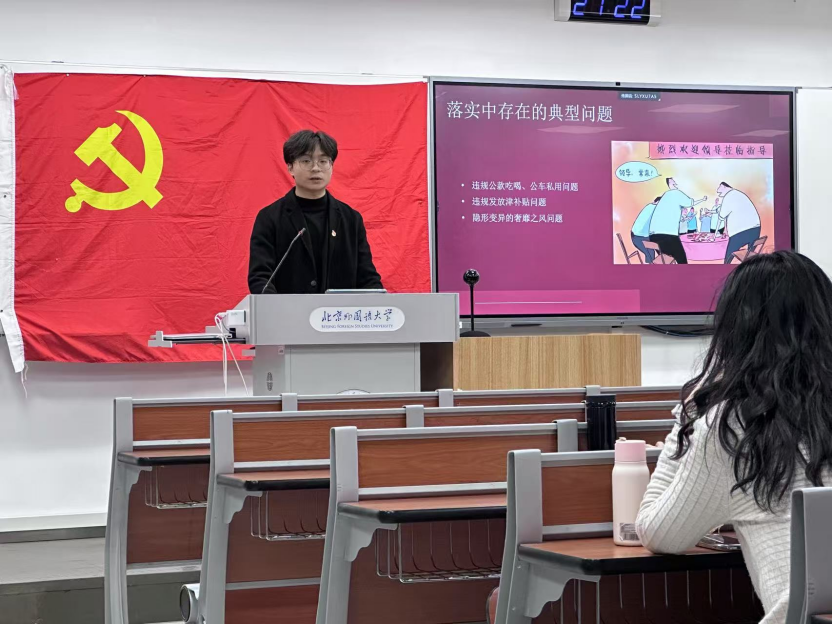 2025年3月25日下午,beat365中国官网beat365中国官网本科生党支部理论学习活动在逸夫楼402顺利举行。本期理论学习由本科生党支部书记孙至善主讲,围绕“中央八项规定精神的内涵与实践要求”展开专题讲解。