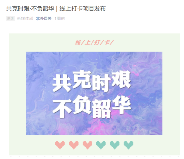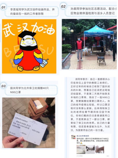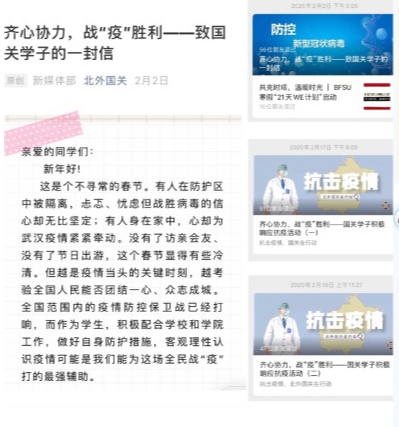 国关学工团队主动搜集我院学子积极参与抗击疫情的事迹,并且通过学院微信公众号进行宣传,展现出北外国关学子心系家国、勇于担当的使命感与责任感,鼓励更多的学生在做好自身防护的同时,积极参与线上线下抗击疫情的活动。