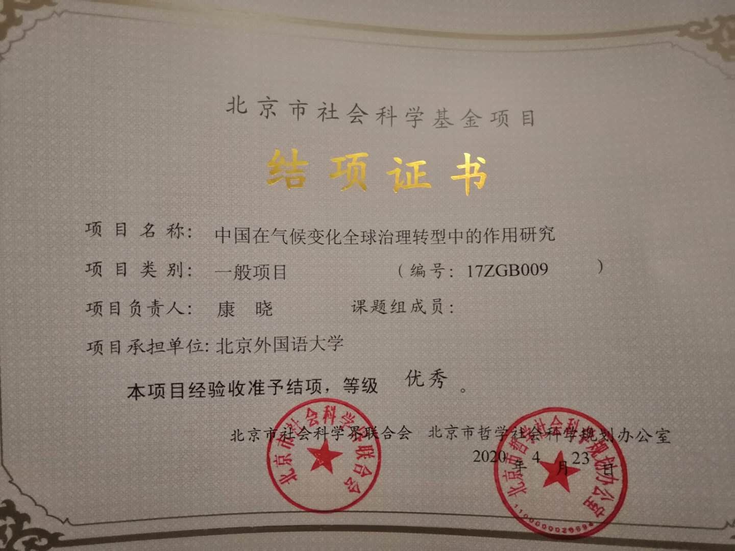 近日,beat365中国官网康晓副教授于2017年主持的北京市社科基金一般项目“中国在气候变化全球治理转型中的作用研究”(项目编号:17ZGB009)顺利提前通过结项,并获评优秀。