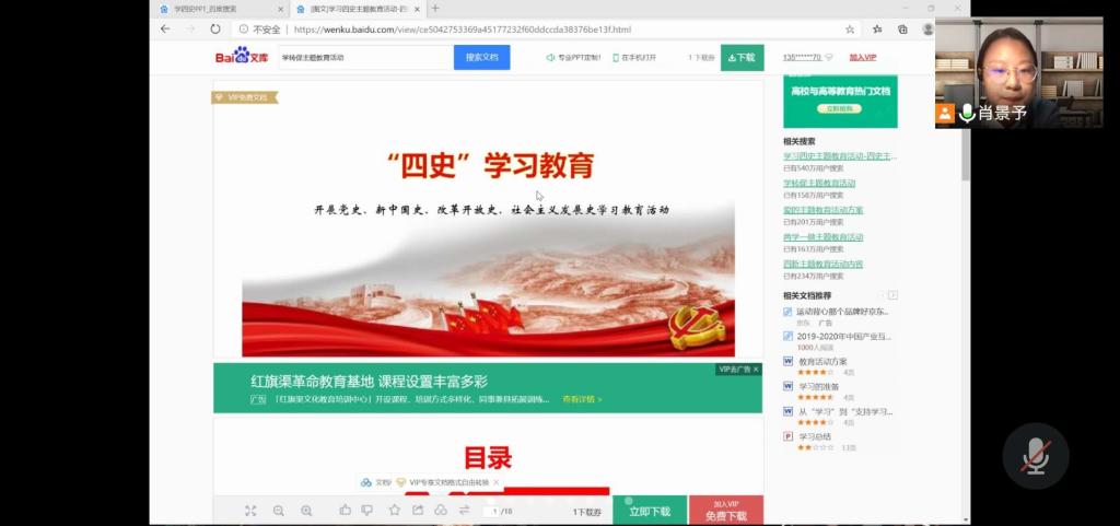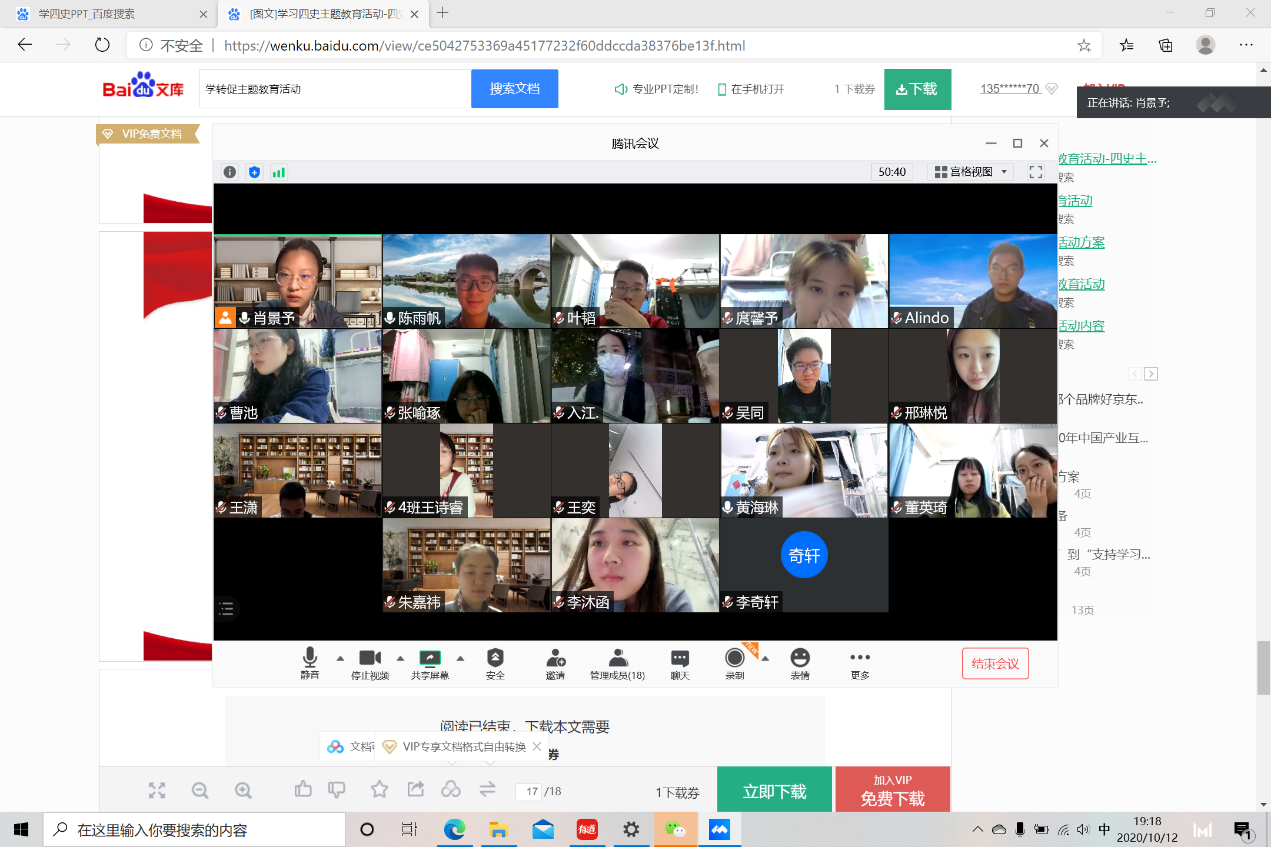 2003班组织大家观看了有关“四史”的影片,1804通过线上会议进行了深入地分组讨论,每个小组都分享了这两天借用网络平台资料和图书馆实体资料对于历史学习的心得体会。每组成员都在会议上进行了发言,主要阐述了学习四史的重要性和学四史中遇到的挑战以及解决方案。通过这样的讨论环节,同学们各抒己见,和别人分享交流,提高了自己的思想认识;