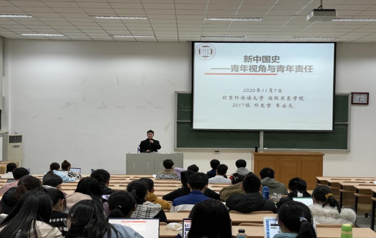 本次活动由国关团总支副书记19级姚佳雨同学主持。会议伊始,她阐述了学习党史与新中国史的重要意义:认真学习“四史”,传承弘扬伟大的革命精神,对于培育和践行社会主义核心价值观具有深远意义。接着,她介绍了本次活动的宣讲人:来自17级的优秀学长韦云杰和潘天一同学。他们向全体20级新生进行了精彩的宣讲。