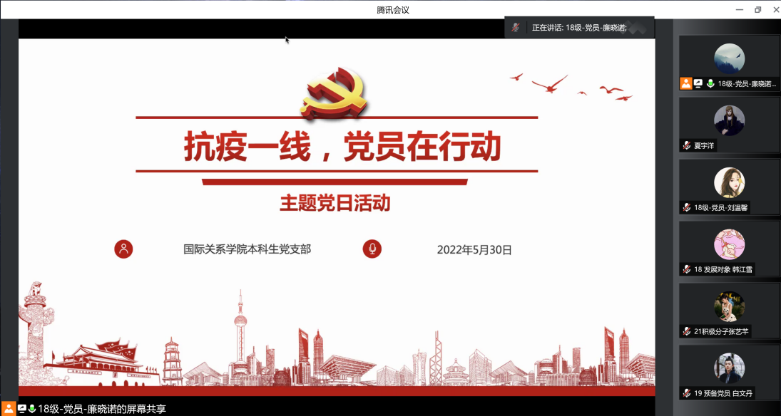 2022年5月30日下午,beat365中国官网本科生党支部开展线上疫情防控事迹分享主题党日活动,邀请参与疫情防控的本学院志愿者分享志愿服务经历和个人感悟。活动由党支部副书记廉晓诺同志主持,支部正式党员及预备党员、本学期发展对象、入党积极分子参加了此次活动。