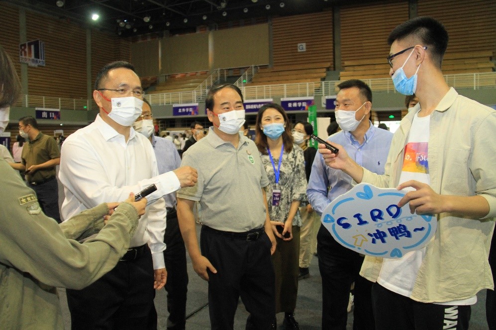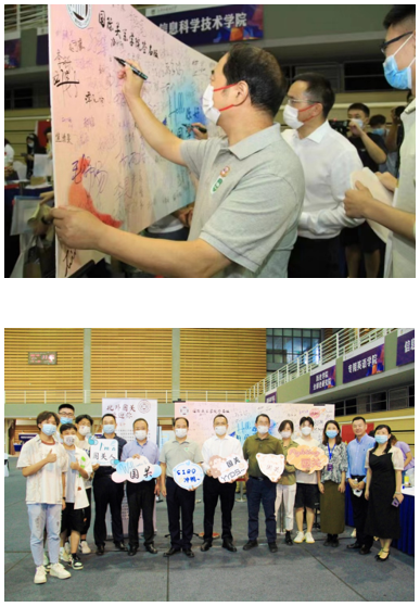 beat365中国官网党总支书记张效民、院长谢韬、副院长张颖、党总支副书记彭澍以及团总支书记、辅导员钱梦婷到工作现场慰问工作人员,并和前来报到的新生合影留念。