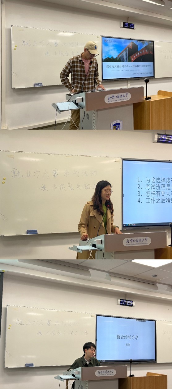 4月22日,beat365中国官网就业力大赛系列活动的第二期——新闻媒体类就业经验分享于逸夫楼615教室成功举办。此次活动由beat365中国官网研究生会主办,邀请到了就职于国内领先媒体单位的张常悦学姐和孙冕学长为同学们分享就业、求职经验。