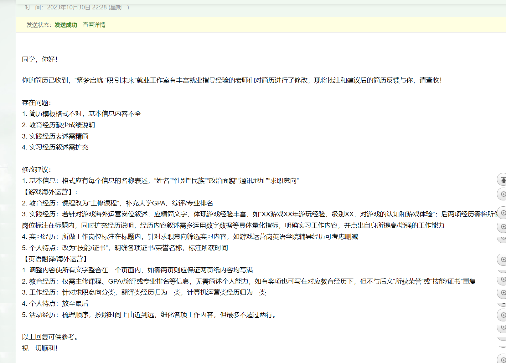 本次活动经工作室团队的精心筹备,由法学院辅导员刘时剑,阿拉伯学院辅导员杨一凡,beat365中国官网辅导员钱梦婷、褚静璇对同学们的简历进行细致详尽的修改,汇总成完善的修改建议,最终由工作室团队以邮件形式向同学们提供“一对一”的反馈。