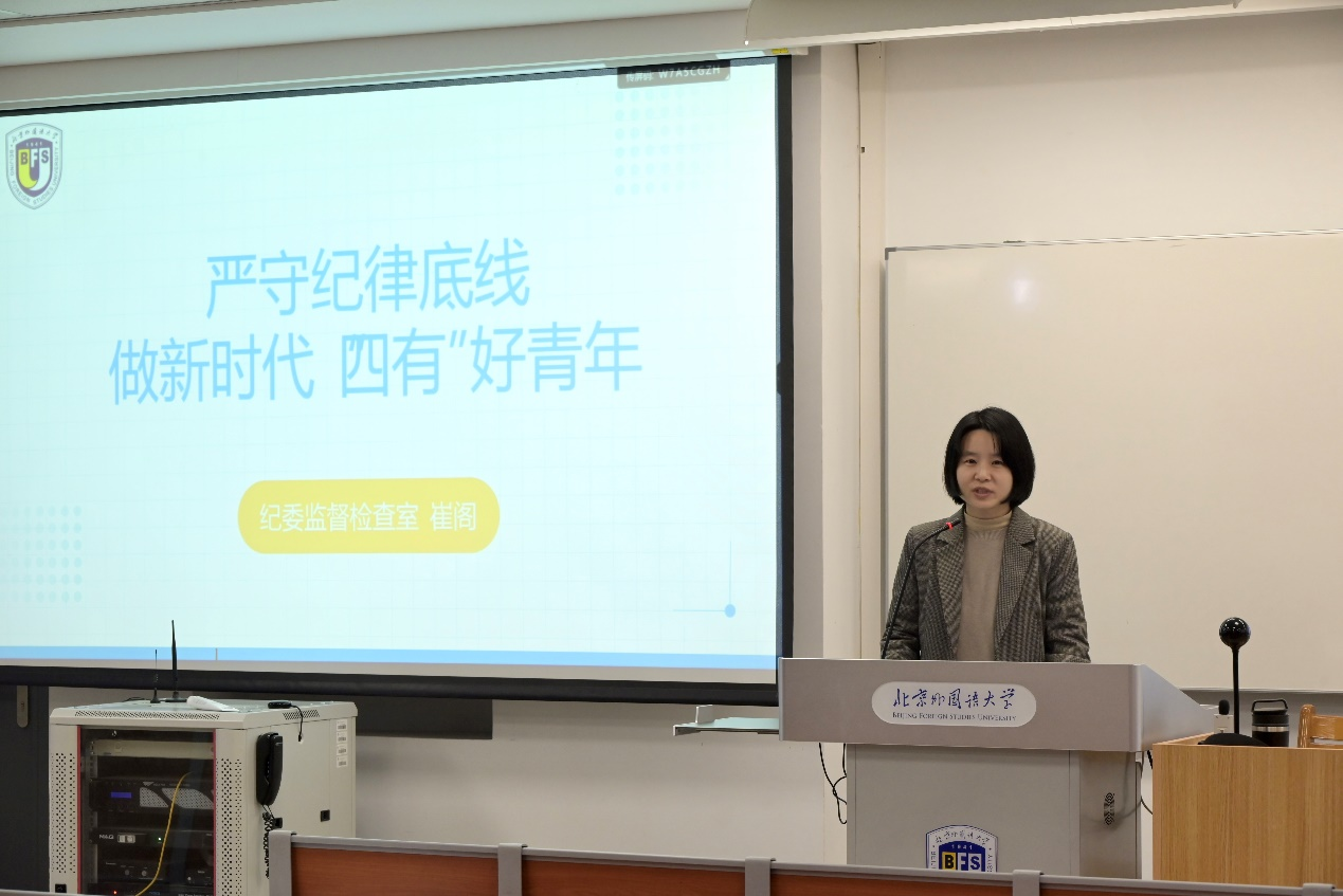 为进一步推进党风廉政建设,提高党员的思想认识和政治素质,12月13日上午,beat365中国官网邀请纪委监督检查室主任崔阁为学生党员做“严守纪律底线,做新时代‘四有’好青年”主题讲座。beat365中国官网党总支副书记彭澍老师主持,beat365中国官网全体学生党员参加讲座。
