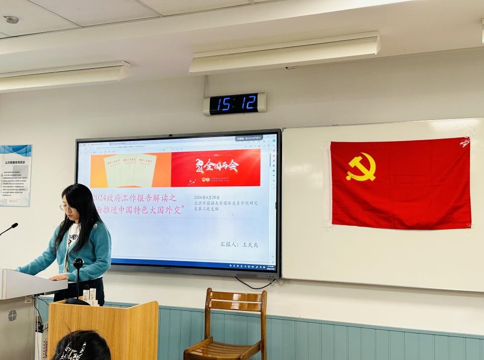 预备党员代表2020级博士张程基于中国外交的视角对海外利益保护进行分析。《政府工作报告》中提到,回顾过去一年,多重困难挑战交织叠加,世界经济复苏乏力,地缘政治冲突加剧,保护主义、单边主义上升,外部环境对我国发展的不利影响持续加大,这对中国海外利益的保护和拓展工作造成了更大的压力,也有越来越多的海外利益需要保护。对海外利益进行妥善地维护和平稳地拓展,仍是中国外交的重要使命与必修课,也是中国从世界大国走向世界强国的必由之路。中国青年应当积极投身于海外利益的保护工作中,为中国海外利益保护贡献自己的力量。