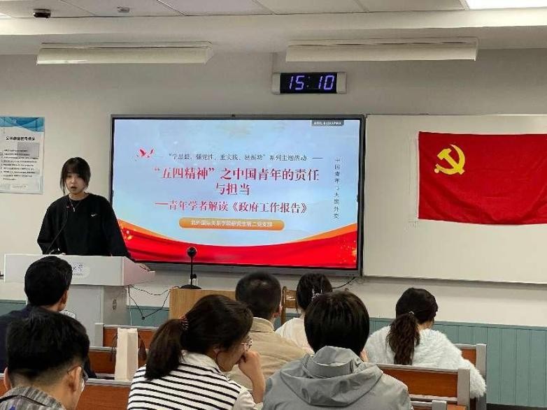 本次主题活动第一项为博士生党员主题发言。2019级博士生王天禹以解读《政府⼯作报告》吹风会为切入点,选取报告中与中国外交相关的重要内容,发表了题为《“新时代新征程”中国特色大国外交的智慧与贡献》的讲话,提出中国外交发展的重点是推动全球安全治理体系改⾰、破解国际安全困境以及推进构建⼈类命运共同体。2019级博士生凌梦远的发言题目为《向“新”力十足,构建新型能源体系建设》,提出新型能源体系是社会主义现代化强国建设的关键抓手、是国家能源安全和国家竞争力的有力保障,也是是实现“双碳”目标以及推进生态文明建设的重要支撑;2021级博士生袁田西竹浅析了当下中国青年的美国观,认为当代青年正站在新的历史起点,生逢其时、重任在肩,应自觉担负起历史使命,助力中国特色大国外交、扬帆前行。青年人承担着中华民族伟大复兴的光荣使命,需要在党和国家对外工作中发挥作用、传播中国故事的积极传播者、实践国家重大外交理念。